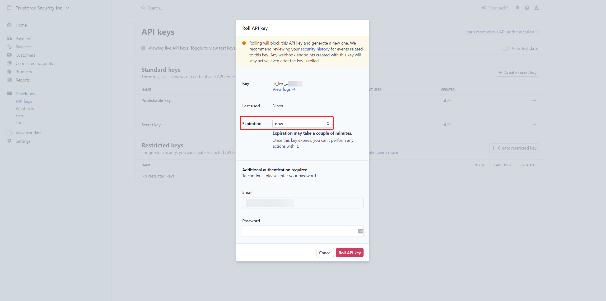 Anschließend kann auf https://dashboard.stripe.com/apikeys im Bereich Standard keys ein Publishable / Secret Key Paar erzeugt werden.